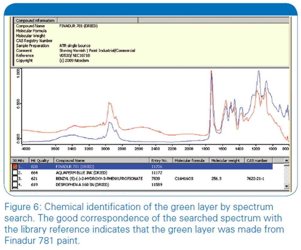 Additionally both varnish layers can be identified by searching individual spectra from any pixel of the chemical image in a spectra library. As an example figure 6 shows the search result for a typical spectrum in the green layer indicating it to be made from the specific paint Finadur 781.